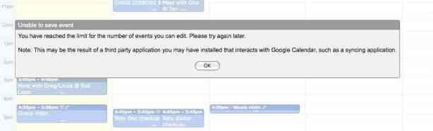 This is now my third day without access to Google calendar — I can’t create anything, delete anything or sync it with my Blackberry. Now, if you use any technology you accept that from time to time things will go wrong. What irks me is that Google seems completely indifferent to user problems. There is absolutely nowhere on their so-called help pages where I can call or e-mail someone directly about my issue. I have to take my chances on the help forums and hope that someone can come up with a fix.(By the way if you’re a Google user and have seen a similar message to the one shown below, let me know.)